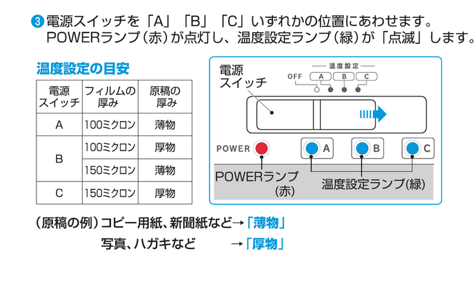 ラミネーターはアイリスオーヤマLTA32E。温度設定はA(薄物)設定で表裏ひっくりかえして2度通す。